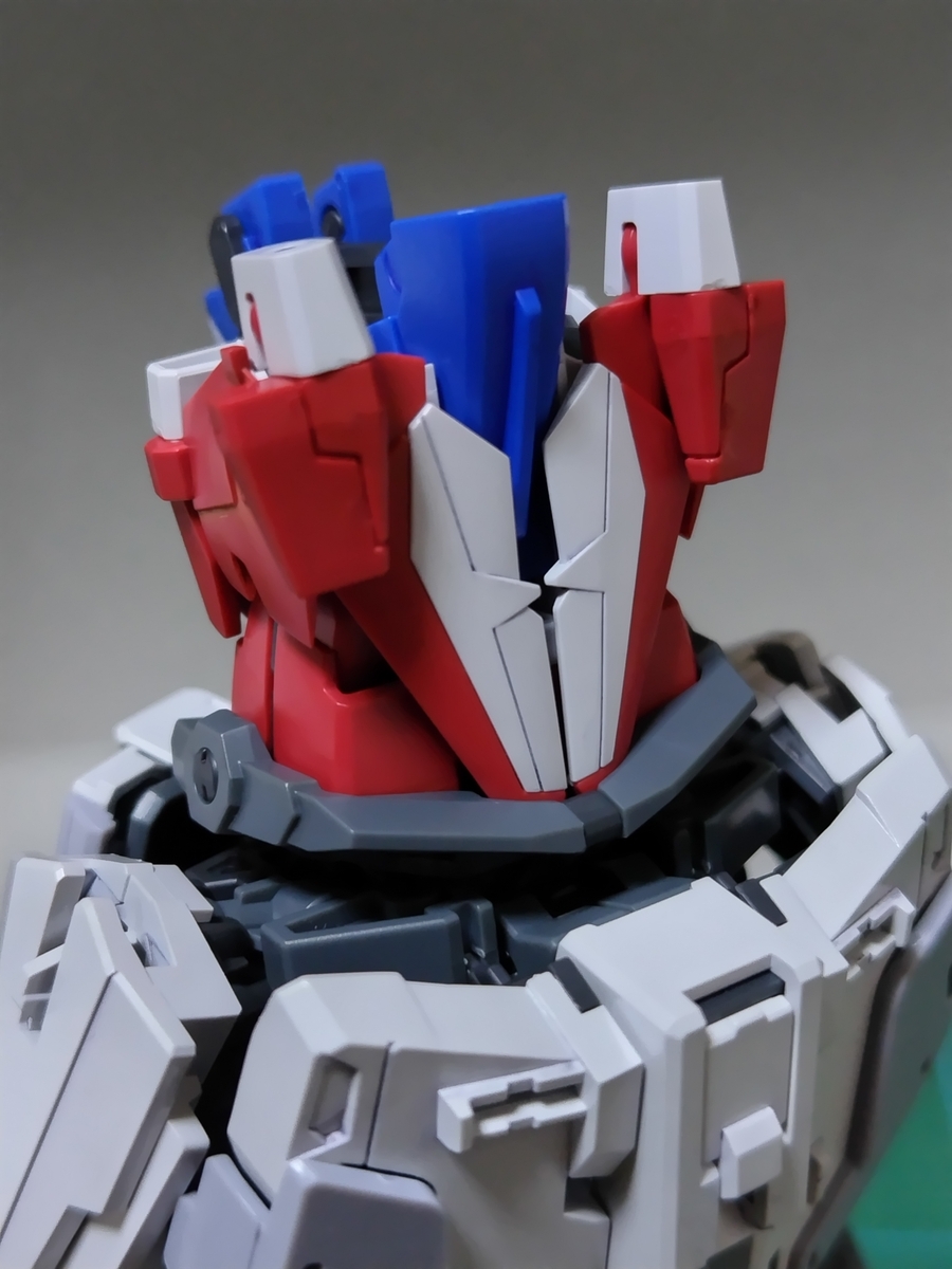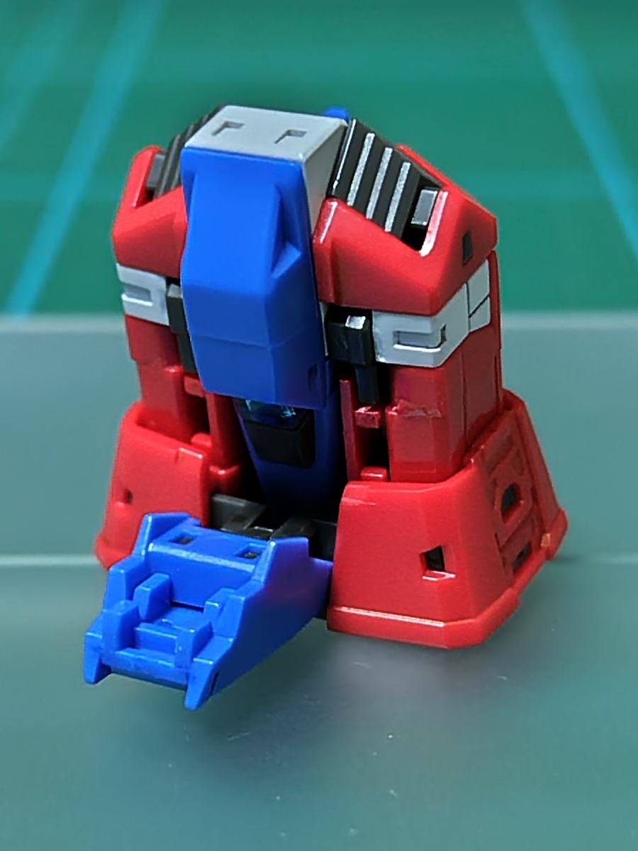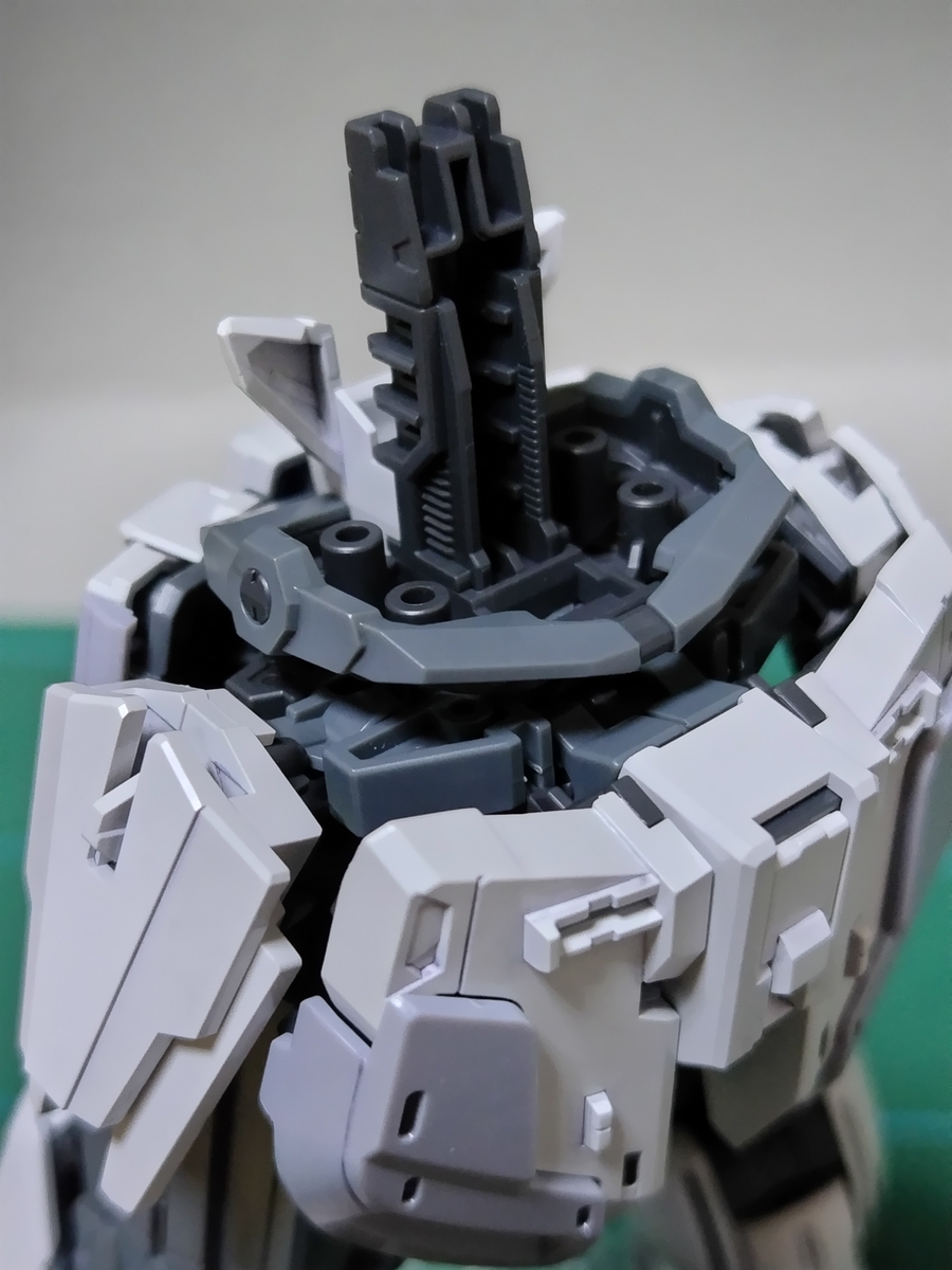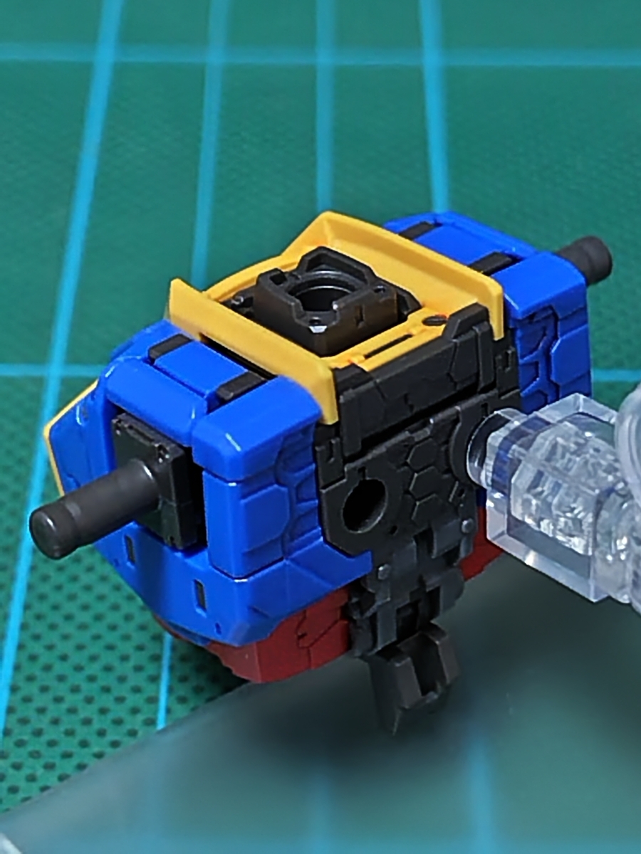 ボディが出来上がったところで変形機構の可動テストをしてみます。ブレードアンテナを収納し、頭部を上向きに。