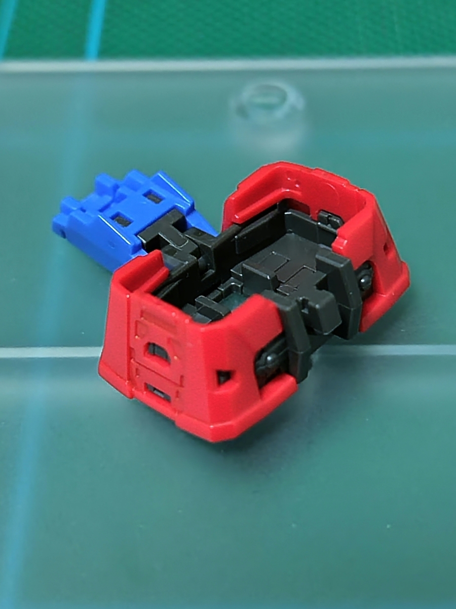 上半身に接続する前に、変形機構の可動テストです。フロントスカートを押し下げ、股関節のロックを外します。
