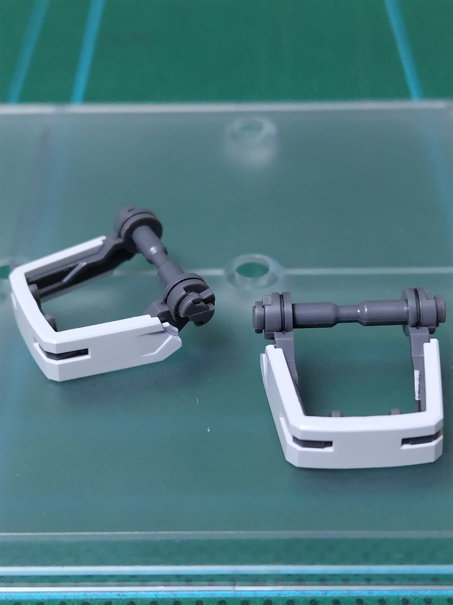 脚部フレーム✕2組立完了です。足首の軸を「しっかり奥まで差し込みましょう」と書かれていますが、変形の関係か足首の左右のロール可動が制限されているので、間違っているのではないかと不安になります。