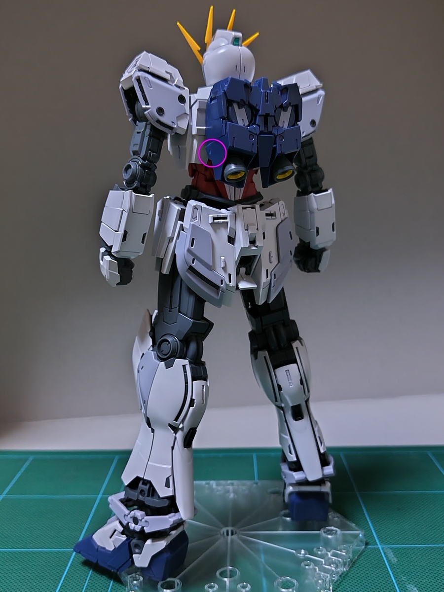 デュアルアイのクリアパーツは、顔のフレームパーツの後ろから差し込んでアイ部分だけが露出するパーツ構成なので、ホイルシールをストレス無く貼ることができます。