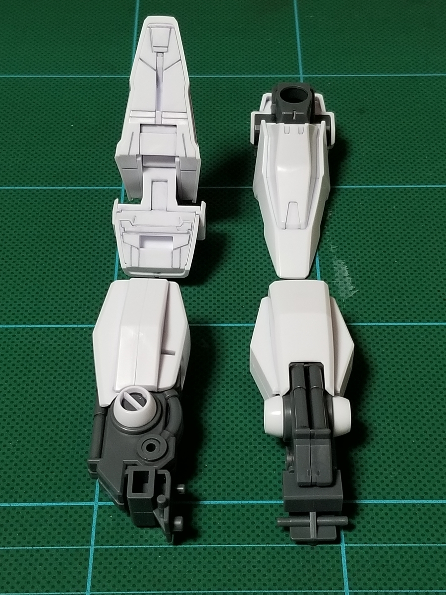 脚×2です。オデュッセウスガンダムの状態では、スリッパが真っ白なので妙な感じです。足裏に肉抜き穴はありません。大腿部の外装は、段落ちモールドが無いので側面に合わせ目が出ます。