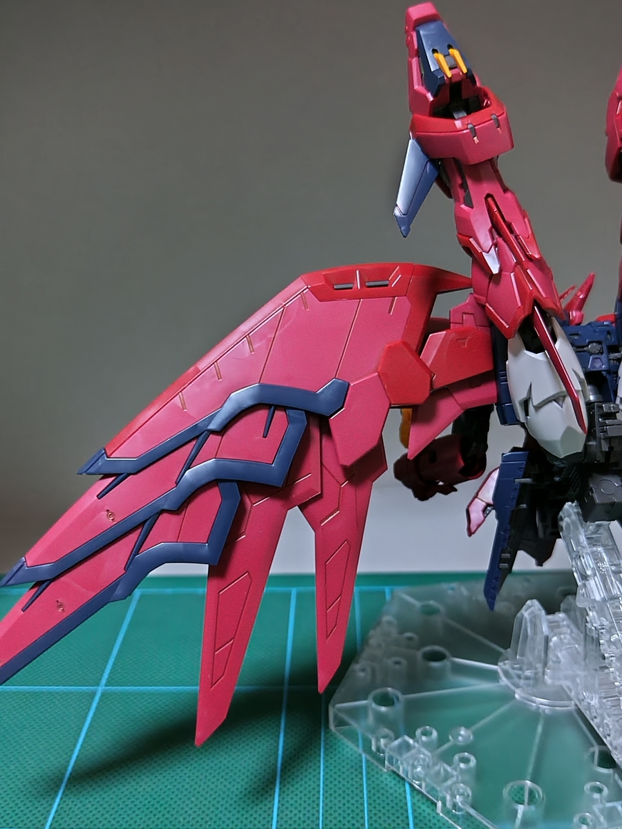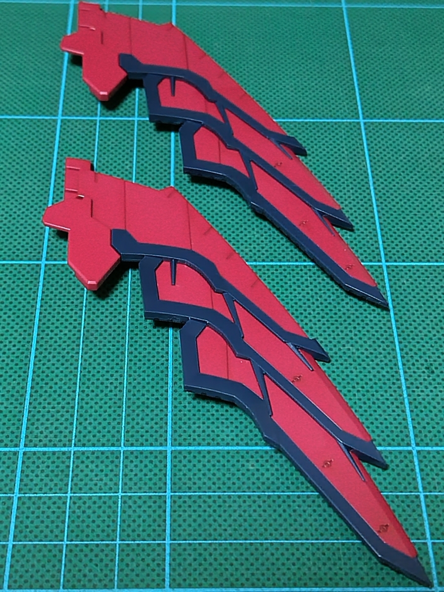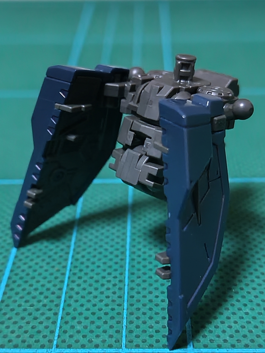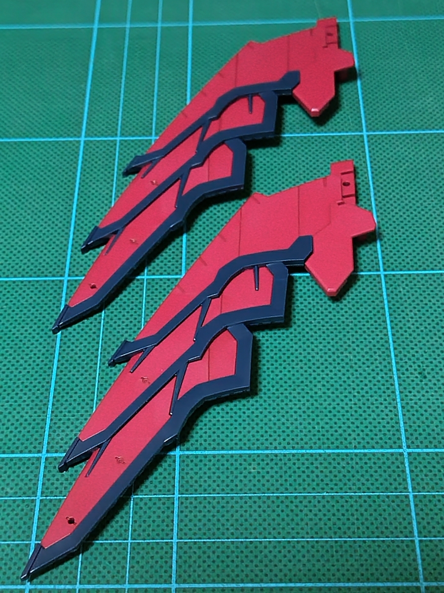 バックパック組立途中です。ウイング✕2です。レッドのパーツとダークブルーのパーツが、それぞれ1パーツで成型されています。